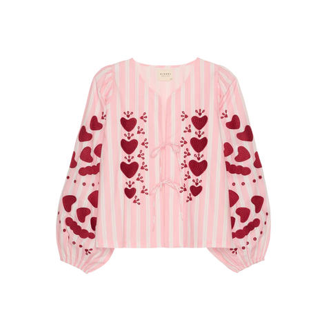 Elisabeth Top er en kort, feminin top fremstillet i 100 % økologisk bomuld. Toppen har voluminøse ærmer med elastik ved ærmeåbningen samt åben front, der lukkes med to sæt fine bindebånd. De delikate hjertebroderier på fronten og ærmerne tilfører et romantisk og eksklusivt udtryk. En let og charmerende top, perfekt til både hverdag og særlige anledninger.