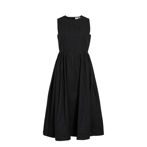 Denne sorte midikjole har en rund halsudskæring og er uden ærmer, hvilket giver et let og afslappet look. Kjolen har en regular fit pasform, der sikrer komfort hele dagen, og dens vævede stof gør den både holdbar og farveægte. Designet er enkelt og tidløst, hvilket gør den ideel til forårs- og sommermånederne. Kjolen er fremstillet med mindst 50 % økologisk bomuld, hvilket tilføjer et bæredygtigt element til dit garderobevalg.