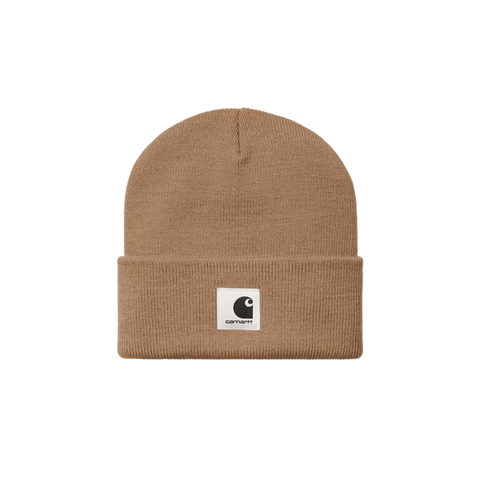 Det er den klassiske hue med ombuk og “Carhartt"-logo på fronten. Det er i en varm stretch ribstrik.