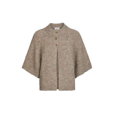 Cardigan med knaplukning foroven samt naturligt fald forneden, Denne cardigan har en blød fornemmelse og er let langhåret i materialet. Derudover har den 3/4 ærmer samt rund almindelig hals.
