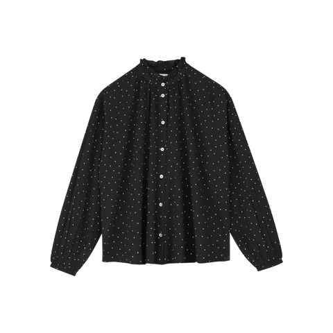 Hannah skjorten fra Skall Studio er en tidløs klassiker med et feminint twist. Den er fremstillet i 100% bomuld og har et let, luftigt udtryk med fine detaljer som små prikker, knaplukning foran og en diskret flæsekant i kraven. De løse ærmer med giver skjorten et afslappet, men elegant fald.