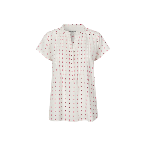 HeatherLL top fra Lollys Laundry i let og luftig kvalitet med et fint print på hvid bund. Den har rund halsudskæring med lille åbning foran og fine læg, som giver et blødt og feminint udtryk. Den afslappede pasform og korte ærmer sikrer god komfort, og toppen er nem at style til både jeans, lette bukser eller matchende nederdel.