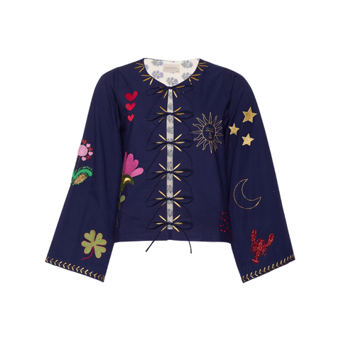 Sophie Top er en kort top med lange, let klokkeformede ærmer og fine bindesnore foran. Den er smukt udsmykket med forskellige former for broderi, der giver et unikt og håndlavet udtryk.