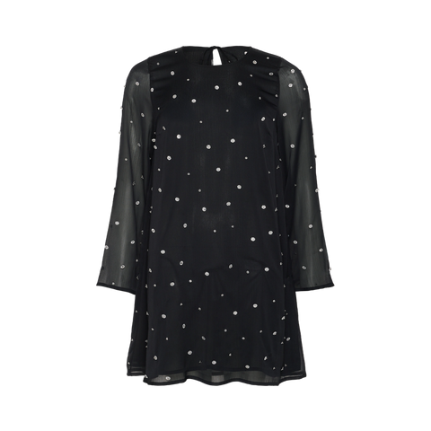 Das Stella Dress ist ein feminines, kurzes Kleid aus feinem Chiffon aus recyceltem Polyester. Das Kleid hat lange, gerade Ärmel und einen runden Ausschnitt mit tiefem Schlitz auf der Rückseite, der mit Bändern geschlossen werden kann. Das gesamte Kleid ist mit funkelnden Strasssteinen verziert, was ihm einen auffälligen und festlichen Look verleiht. Die Innenseite ist mit weicher Viskose gefüttert, was für ein angenehmes Tragegefühl sorgt.
