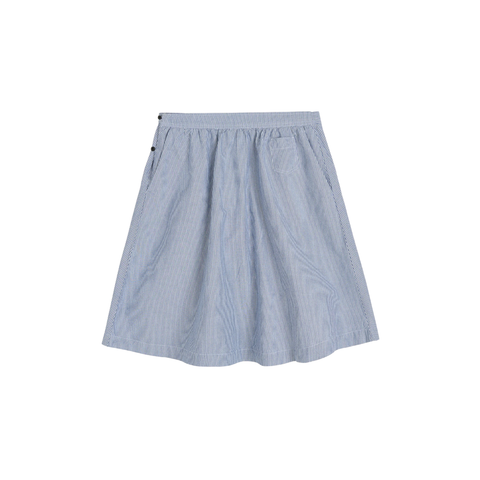 Tidløs, mellemlang nederdel i fin økologisk bomuld med et elegant, blåstribet mønster. Nederdelen har en let A-formet silhuet, elastik bagtil i taljen, knaplukning i siden samt rummelige skrålommer og en dekorativ lomme, der giver et feminint og afslappet udtryk. Perfekt til både hverdag og sommergarderoben.
