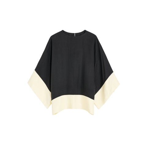 Elegant bluse med firkantet silhuet og brede, cropped ærmer i en oversize pasform. Den er fremstillet i cupro – et silkeblødt og åndbart materiale, der føles let mod huden. Cupro har en smuk, let skinnende overflade og et glidende fald, som giver blusen bevægelse og et eksklusivt udtryk. Foran har den en enkel krog- og låslukning, der giver mulighed for at style den både lukket og åben.