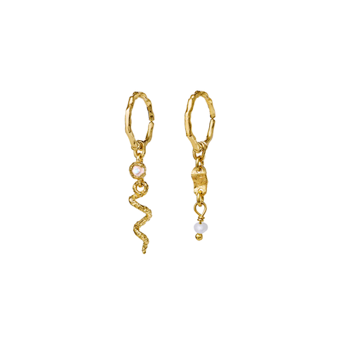 Evelyn øreringe i forgyldt sølv kombinerer en smuk regnbuemånesten og en elegant ferskvandsperle, der falder fra en ujævn, forgyldt ring i to fine, snørklede tråde. Et delikat og enkelt design med et eventyrligt og klassisk udtryk – perfekt til både hverdag og fest.