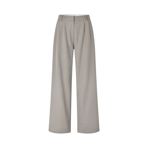Plisserede bukser med vide ben. Blødt og glat stof. Skjult lynlås, hægte- og knaplukning. To sidelommer og to pyntelommer bagpå. Plisserede detaljer foran. Mellemhøj talje og vide, lige ben.