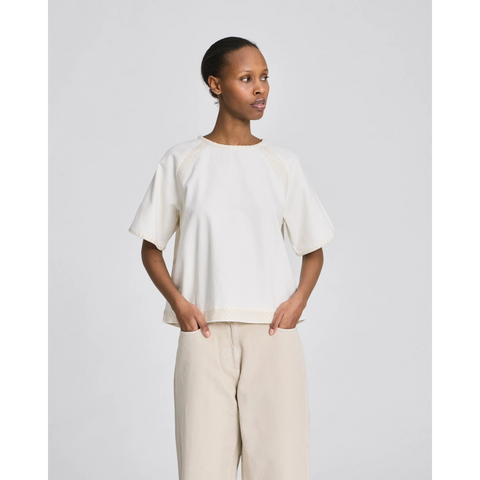 Angie er en kortærmet T-shirt fremstillet i 100 % økologisk bomuldstwill, som giver en let struktur og et eksklusivt udtryk. Den er designet med rund halsudskæring og nøglehulslukning, raglanærmer samt dekorative broderidetaljer både foran og bagpå. T-shirten har en lige, cropped pasform, der giver et moderne og afslappet look.