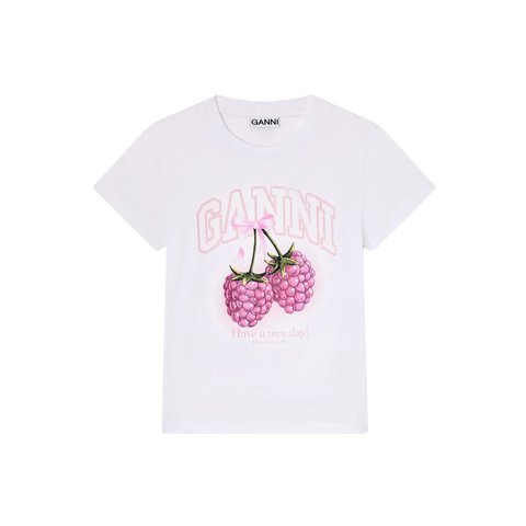 En legende og feminin T‑shirt med et tydeligt grafisk udtryk. Den sidder tæt på kroppen og har en klassisk rund hals, kombineret med et iøjnefaldende hindbærmotiv og GANNI‑logo foran. En perfekt statement‑tee, der giver dit outfit personlighed, uanset om den styles alene eller lag på lag.
