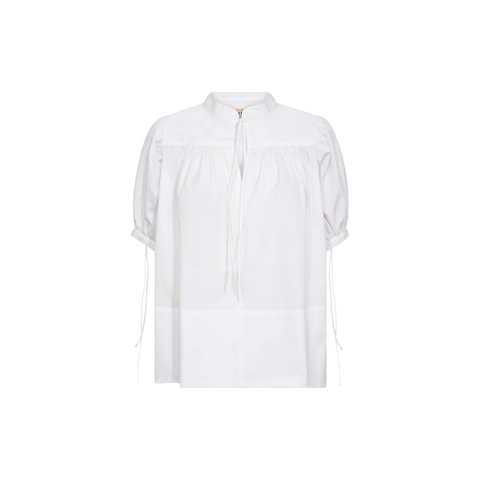 Let og feminin bluse i økologisk bomuld, designet med et moderne og stilrent udtryk. Blusen har en elegant båndkrave, korte ærmer med justerbare snører samt fine rynkedetaljer, der tilfører ekstra volumen og et blødt fald.
