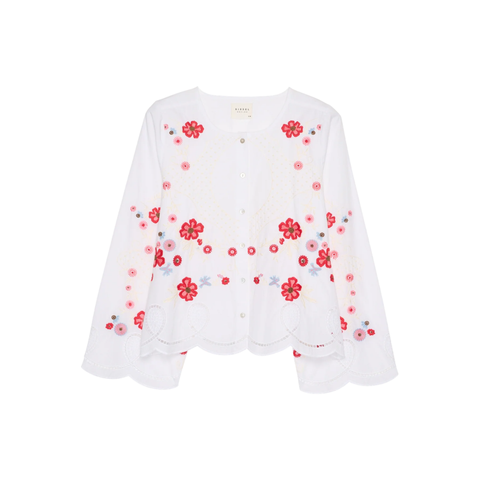 Vitus Shirt er lavet i 100 % økologisk bomuldspoplin og har en afslappet pasform. Skjorten har en rund halsudskæring med en stolpe foran og lyse perlemorsknapper. Den har lange, brede ærmer. Skjorten er dekoreret med delikat cutwork og blomsterbroderi og er afsluttet med en bølgeformet kant forneden.