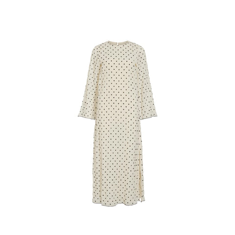 Denne lange kjole har en rund hals og lange ærmer med et voluminøst design, der giver et moderne og stilfuldt udtryk. Kjolen har knaplukning foran og et print, der går igen over hele stoffet, hvilket tilfører et unikt og livligt præg. Pasformen er almindelig, hvilket gør den behagelig at have på hele dagen. Farven "Cloud dancer" fremhæves af sorte prikker, der tilføjer et delikat og feminint touch til det samlede look.